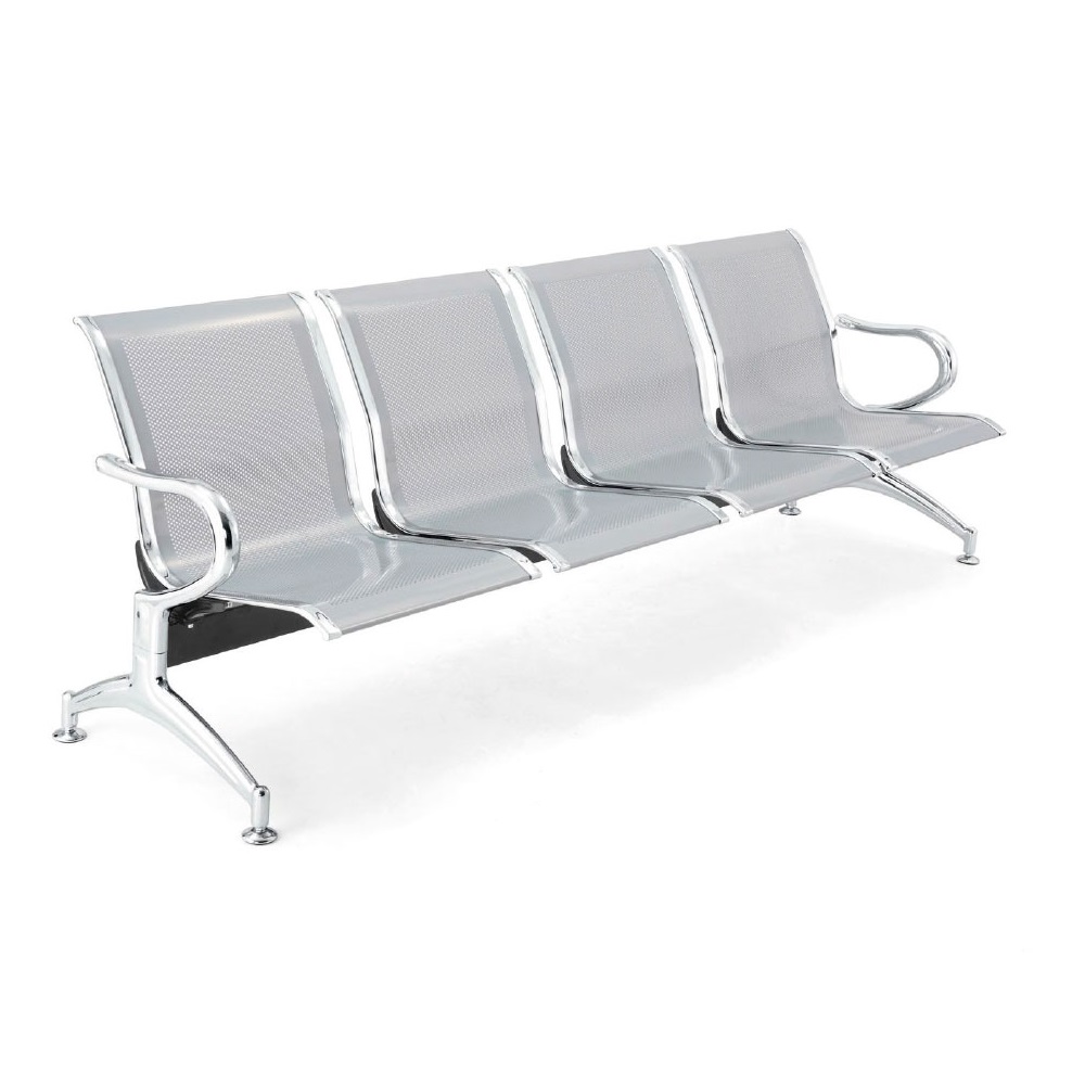 -4 Asientos en metal cromado con reposa brazos en los extremos, patas de metal cromado. Medida 238x80x57cm. Peso 33kg.